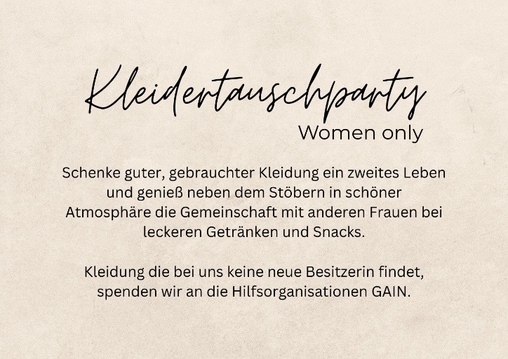 Schenke guter, gebrauchter Kleidung ein zweites Leben und genieß neben dem Stöbern in schöner Atmospäre die Gemeinschaft mit anderen Frauen, vei leckeren Getränken und Snacks. Kleidung die bei uns keine neue Besitzerin findet, spenden wir an die Hilfsorganisation GAiN.